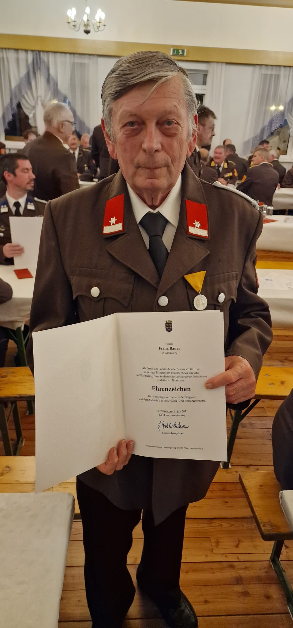 Unserem Kameraden Franz Bauer wurde am 21.4. im Rahmen des Abschnittsfeuerwehrtags in Ollern das Ehrenzeichen für 40 Jahre verdienstvolle Tätigkeit im Feuerwehrwesen von der Landeshauptfrau Johanna Mikl-Leitner verliehen. Wir gratulieren herzlichst.