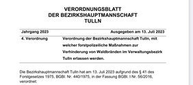 Gemäß Waldbrandverordnung der BH-Tulln vom 13. Juli 2023 sind im gesamten Verwaltungsbezirk Tulln das Rauchen sowie jegliches Feuerentzünden im Wald und in dessen Gefährdungsbereich verboten! Die Verordnung tritt mit Ablauf des 31.10.2023 wieder außer Kraft.