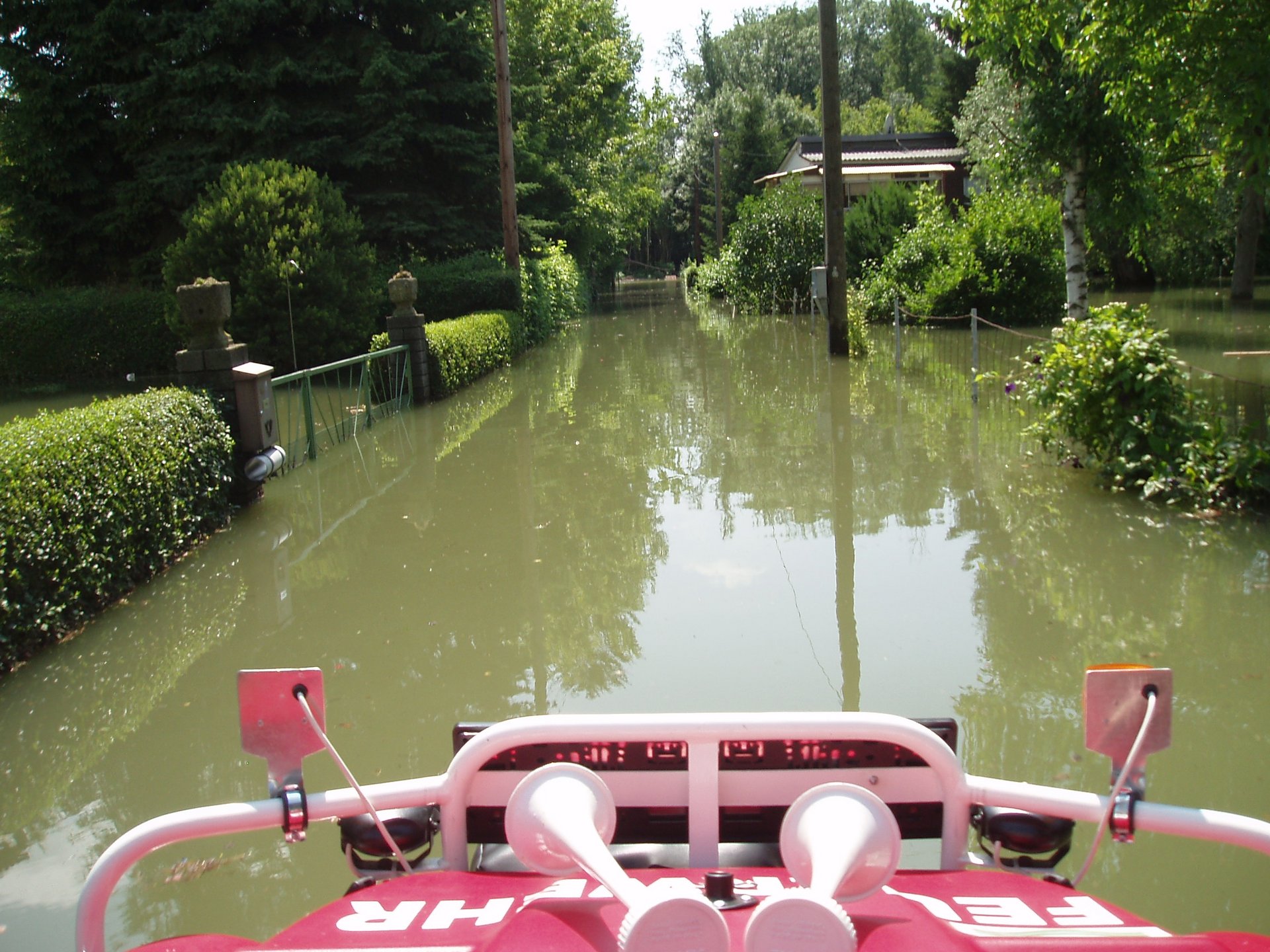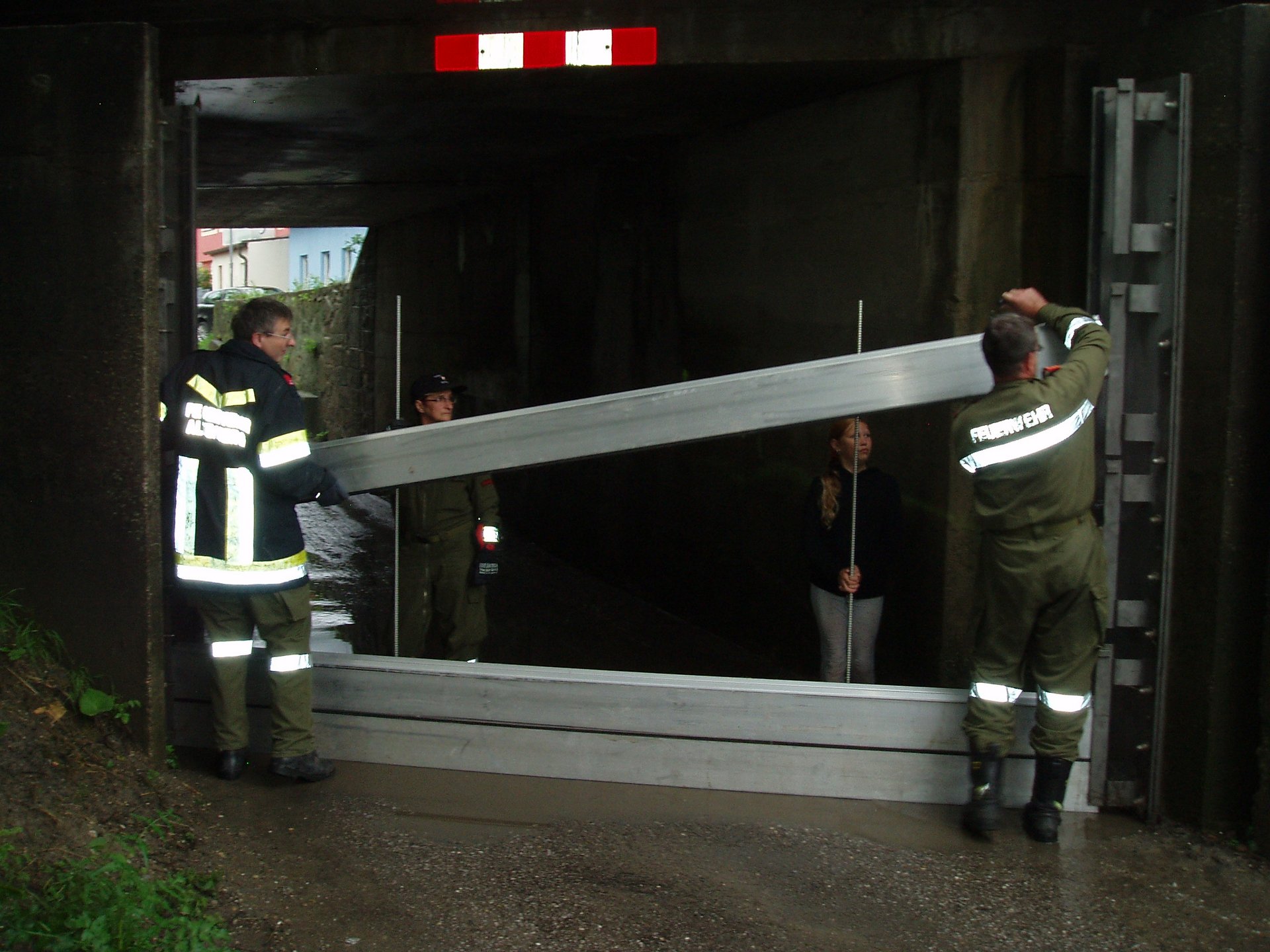 Ab 23.06. 13:00 Uhr war die Feuerwehr Altenberg im Hochwassereinsatz. Um 15:24 Uhr bekamen wir von der Gemeinde den Hochwasseralarm der Bezirkshauptmannschaft Tulln übermittelt. Vorerst mussten wir laut Alarmplan Hochwasser die Bevölkerung der Badesiedlung mittels Lautsprecherdurchsage warnen, damit sie ihre persönlichen Vorkehrungen treffen,die Kraftfahrzeuge aus der Siedlung entfernen und die Verkehrswege freihalten müssen. Anschliessend wurde auf unseren Kontrollfahrten der Wasserstand laufend beobachtet. Am 24.06. um 06:30 Uhr mussten wir den kleinen Bahndurchlass des Lorenzgrabens schliessen, damit das Hochwasser sich nicht zurückstaut und das Brunnenschutzgebiet überflutet. Ein Schliessen dieses Durchlasses hat zur Folge, dass wir das Regenwasser, welches vom Berg nachkommt, über den Bahndamm pumpen müssen. Für diese Tätigkeit waren 2 Unterwasserpumpen mit jeweils 1300 Liter Förderleistung pro Minute und 15 B- Schläuche notwendig. Im Anschluss wurden wieder Kontrollfahrten durchgeführt. Um 11:55 Uhr wurden wir von der Polizei St. Andrä Wördern beauftragt, einen PKW ohne Kennzeichen vom Bahnweg wegzuschleppen und sicher abzustellen, da dieser schon bis zu den Rädern im Wasser stand. Um 15:45 Uhr mussten wir aufgrund der Tatsache, dass das Wasser bereits am Altenbergerweg bis zur Verlängerten Donaustraße stand, die Bahnunterführung - Donaustraße mit den Aluelementen abriegeln, dies muss zeitgerecht geschehen, da man diese Elemente einbauen muss, bevor das Wasser in der Unterführung steht. Am 25.06. um 08:00 Uhr konnten wir die Unterführung Donaustraße wieder freigeben, da das Wasser wieder etwas zurückgegangen war. Um 20:55 Uhr wurden wir vom Obmann der IGM Dschungeldorf zu Auspumparbeiten am Unteren Ohnewasweg 23 gerufen. Der Grund für diese Pumparbeiten war ein Überlaufen des Kanalsystems. Am 26. 06. um 04:02 Uhr wurden wir von Florian NÖ wieder zu Auspumparbeiten zur selben Adresse gerufen. Diesesmal strömten jedoch die Abwässer laufend aus dem Kanal. Nach Rücksprache mit dem Kanalwartungsorgan der Gemeinde St. Andrä Wördern wäre es nicht sinnvoll gewesen, Pumparbeiten durchzuführen solange des Wasser aus dem Kanal strömt. Somit rückten wir wieder ab und die Gemeinde nahm sich zu Dienstbeginn der Sache an. Im Laufe des Tages wurden noch diverse Auspumparbeiten durchgeführt, die Pumpen und die Absperrung des Durchlasses Lorenzgraben wurden abgebaut, die Geräte gereinigt, Einsatzbereitschft hergestellt und um 20:50 Uhr der Hochwassereinsatz beendet. Während des Hochwassereinsatzes wurden mit unserem Amphibienfahrzeug laufend Kontrollfahrten durchgeführt, welches sich durch den Wasserstand - teils Straße teils Wasser - sehr gut bewährte.Die Feuwerwehr Altenberg war bei diesem langen Einsatz mit durchschnittlich 11 Mann und allen 3 Fahrzeugen im Einsatz. Am 27.06. um 10:00 Uhr rückten wir aus, um die Straße - Längsweg 1 - zu reinigen, da dieser durch den augepülten Schotter nicht befahrbar war. Am 29.06. vormittags wurde wieder Hochwasserwarnung gegeben. Ab 10:00 Uhr waren wir wieder im Einsatz. Es wurden wieder Kontrollfahrten durchgeführt, ein Boot aus dem Altarm geborgen und die Unterführung Donaustraße ausgepumpt.