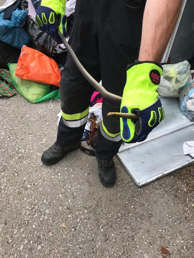 Am 20.7. wurden wir um 15:13 Uhr zu einer Tierrettung gerufen. In einem Humana Sammelcontainer wurde eine Schlange gesichtet. Nach Rücksprache mit Humana brachen wir den Container auf und retteten das Tier.