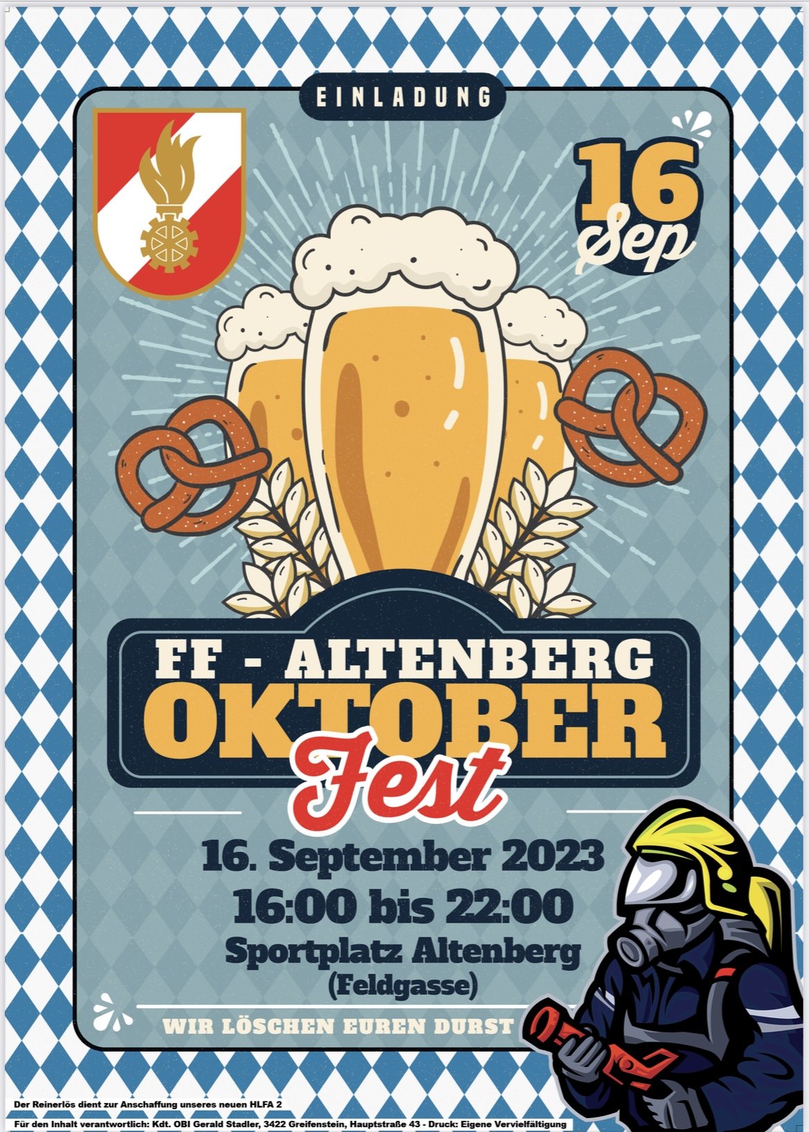 Am 16. September findet unser Oktoberfest am Sportplatz Altenberg (Feldgasse) von 16 bis 22 Uhr statt.